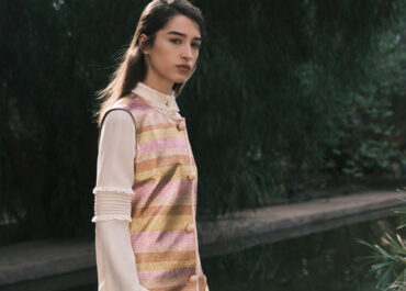 Comprising six ready-to-wear looks, the capsule blends the Maison’s signature sophistication with the warmth and radiance of the season. Fluid cady couture gowns with V Gold detailing sit alongside coordinated trouser sets, kimono silhouettes and kaftan-inspired pieces, all rendered in luminous rose gold tones and richly textured fabrics. Decorative motifs and feather accents add subtle drama, while side splits and jewel buttons introduce a modern edge.
