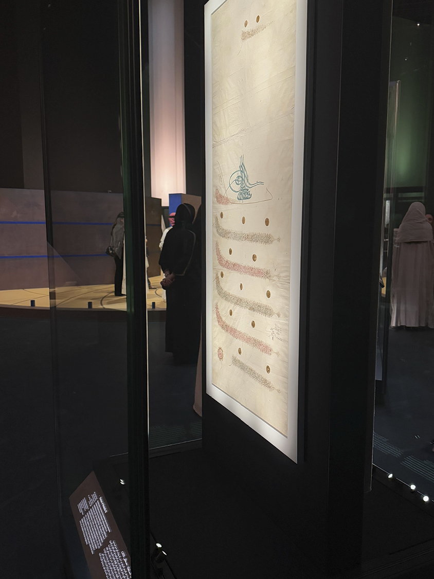 One notable piece on display is a significant firman (royal decree) issued by Sultan Mustafa III concerning the tomb of the Prophet Muhammad (PBUH) in Madinah. This decree appoints a man named Bashir Agha as the overseer of the tombs endowments. Written in six lines of elegant Diwani script, the firman outlines Bashir Agha’s responsibilities and specifies the financial arrangements associated with his role.