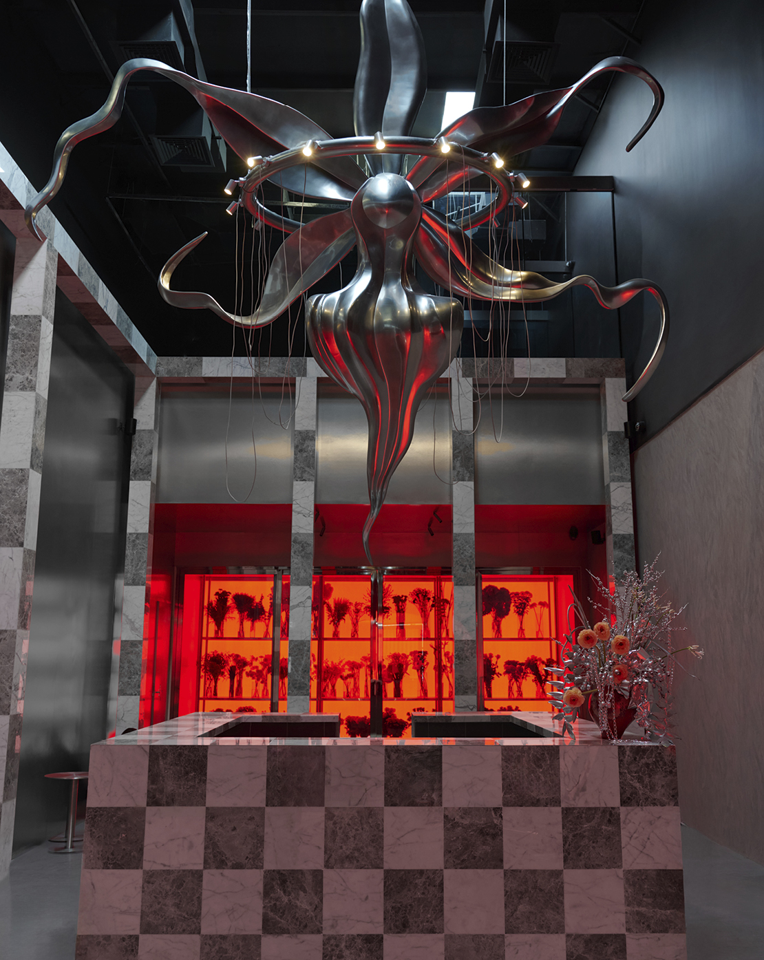 The aluminium orchid structure is one of the defining elements of the space. How did the idea for this dramatic centrepiece emerge, and what does the orchid represent within the project?