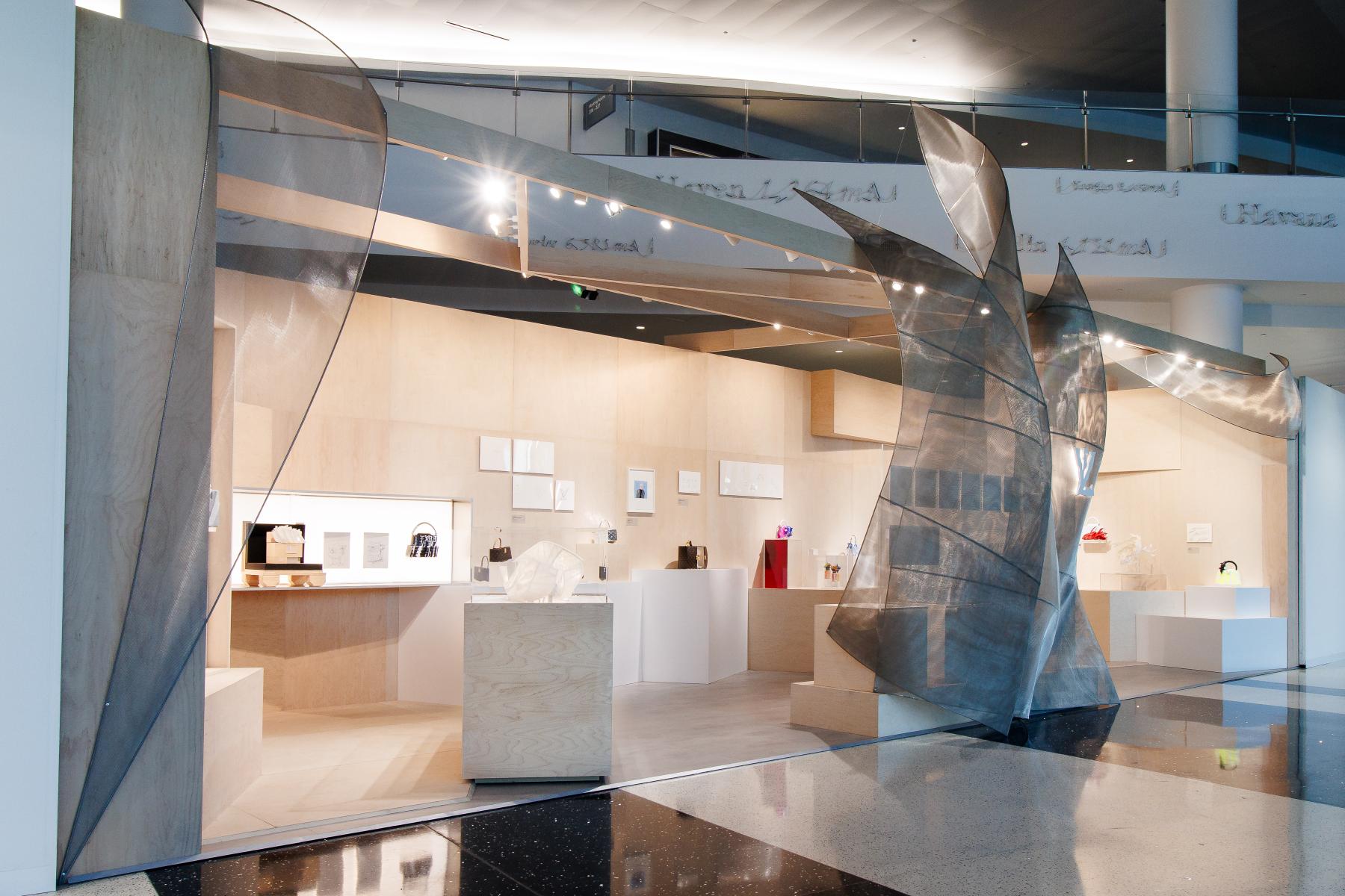 Organized into four themes dear to Frank Gehry – Architecture and Form, Material Exploration, Animals, and his Twisted Box creation for “Celebrating Monogram”– the objects on display include handbags, trunks, perfume bottles, original artworks, preparatory sketches, and architectural models.