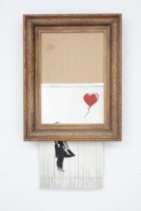 In October 2018, one of Banksy’s works and perhaps the most iconic of all, Balloon Girl, was sold in an auction at Sotheby’s in London for a record-breaking £1.04m. However, shortly after it was sold, an alarm sounded inside of the picture frame and the canvas passed through a shredder hidden within the frame, partially shredding the picture. Banksy then posted an image of the shredding on Instagram captioned “Going, going, gone…”. After the sale, the auction house acknowledged that the self-destruction of the work was a prank by the artist. A man seen filming the shredding of the picture during its auction was actually suggested to be Banksy although the reports have never been confirmed. Banksy has since released a video on how the shredder was installed into the frame and the shredding of the picture, explaining that he had fitted the painting with the shredder a few years previously, in case it ever went up for auction. To explain his rationale for destroying his own artwork, Banksy quoted Picasso: “The urge to destroy is also a creative urge” The woman who won the bidding at the auction decided to go through with the purchase. The partially shredded work has been given a new title, Love is in the Bin, and it was authenticated by Banksy’s authentication body Pest Control. Sotheby released a statement that said “Banksy didn’t destroy an artwork in the auction, he created one,” and called it “the first artwork in history to have been created live during an auction.”
