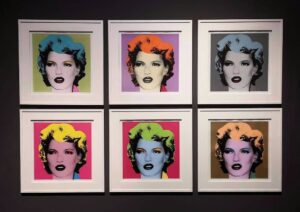 As his success began to grow the artist developed a global celebrity following, with many world-famous actors, athletes, musicians, and fellow artists, including Christina Aguilera, Justin Bieber, Serena Williams and Angelina Jolie, having acquired his work. His works started to sell for tens of thousands of British pounds. On 19 October 2006, a set of Kate Moss paintings sold in Sotheby’s London for £50,400, setting an auction record for Banksy’s work. The six silk-screen prints, featuring the model painted in the style of Andy Warhol’s Marilyn Monroe pictures, sold for five times their estimated price. Their stencil of a green Mona Lisa with real paint dripping from her eyes sold for £57,600 at the same auction.
