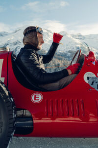 The intersection of driving and design has also inspired one of Loro Piana’s most iconic pieces: the Roadster jacket. Originally created in 2004 to mark the 75th anniversary of the Concorso d’Eleganza di Villa d’Este, the Roadster embodies functionality, elegance and freedom of movement. For The I.C.E. St. Moritz 2026, an exclusive capsule collection expands on this legacy, featuring men’s and women’s Roadster styles crafted in Cash Coarsehair Storm System® fabrics, alongside knitwear, leather driving gloves and silk foulards adorned with car-inspired motifs.