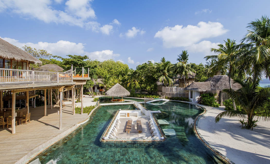 The island itself is one of the largest in the Maldives, lush with jungle pathways, towering palms and pristine beaches that feel refreshingly untouched. Villas are hidden within dense greenery or poised over crystal clear waters, offering complete privacy and a profound sense of seclusion.