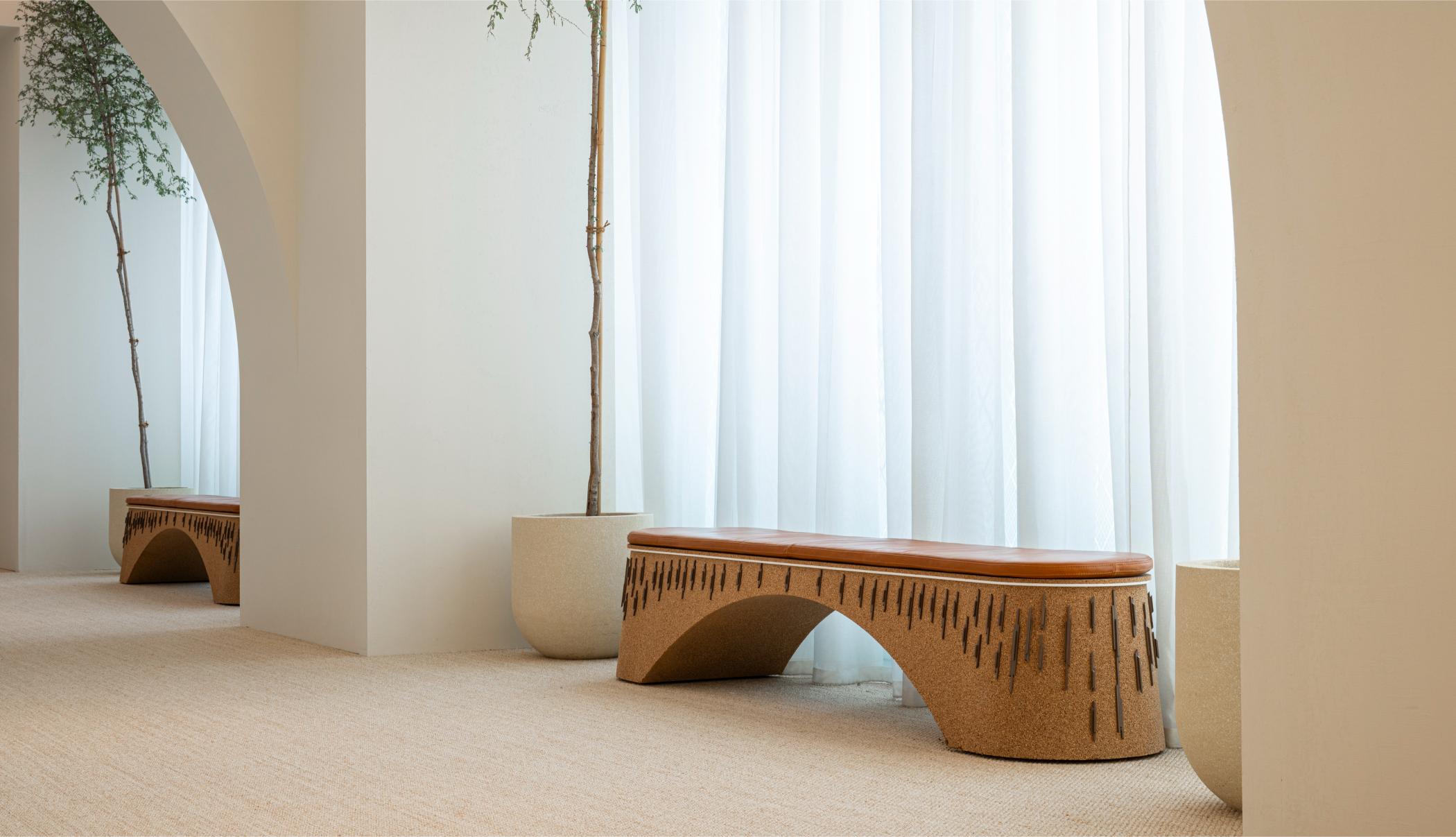 Kaseeriya is a bench and stool set made from HDF, plyboard and recycled cork and covered with Palmade bioplastics. Driven by sustainability and inspired by the UAE, the Kaseeriya bench embodies the essence of simplicity and elegance and signifies unity, strength and togetherness.