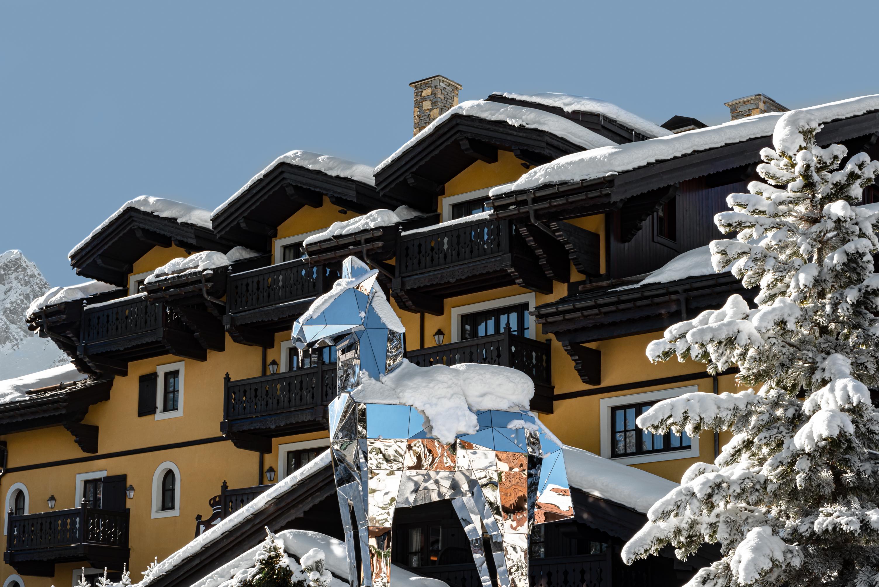 Art aficionados will revel in the Maison’s curated collection, featuring standout pieces like Paola Pivi’s feathered L’Ours Rouge and Andreas Gursky’s mesmerizing Engadin photograph. Even the property itself is a masterpiece, with its ochre façade and carved wooden balconies paying homage to Alpine heritage. At the entrance, Bruno Peinado’s mirrored horse sculpture stands as a beacon of elegance and wonder.