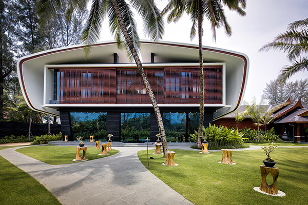Villa Siam is designed by Eggarat Wongcharit and is a maximalist fantasy inspired by Thai culture and Buddhism; includes beds and sofas hanging from the ceiling by wicker bamboo. The villa’s own spa is located within an ancient Thai bell, with Buddhist teachings translated into English inscribed in the walls.