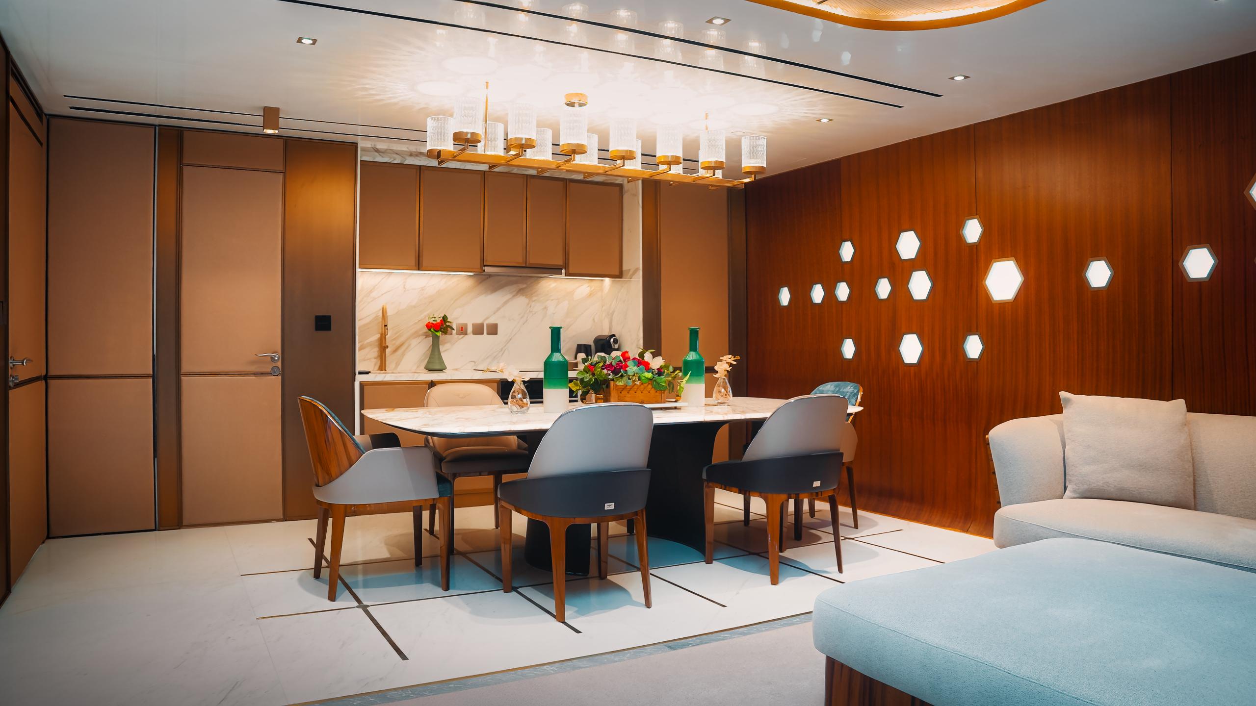 The 24 Floating Residences will extend the concept offshore, integrating marine engineering with luxury hospitality. Each residence will span around 4,000 square feet across three levels, accommodating up to eight guests. Highlights include a rooftop deck with jacuzzi and dining area, a sea-level living space with panoramic windows and overwater hammocks, and an underwater level featuring bedrooms framed by coral gardens. Materials will include tactile woods, veined stone and maritime glass, with optional Bentley Home furnishings.