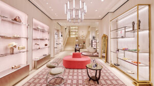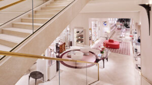 Designed to feel more like a sophisticated Parisian residence than a traditional boutique, the new flagship blends architecture, art and craftsmanship. A striking staircase and stone flooring create a strong sense of place, while soft textures, layered materials and warm tones add a residential elegance. Velvet, bouclé, suede and lacquered finishes are combined with polished metals and curated furnishings, creating a space that reflects the maison’s timeless yet contemporary aesthetic.