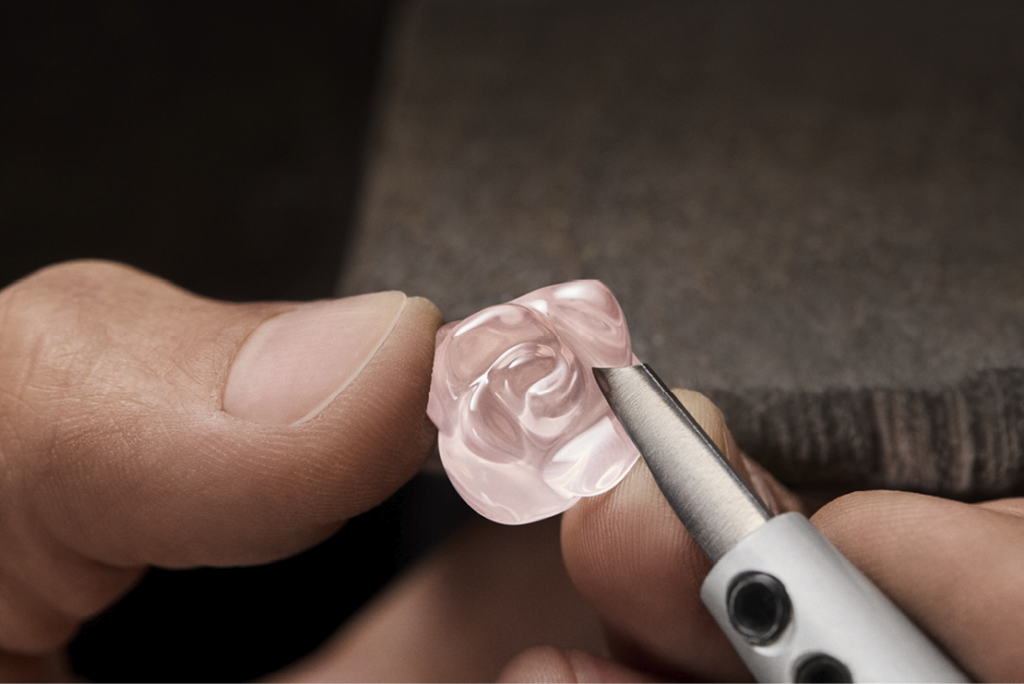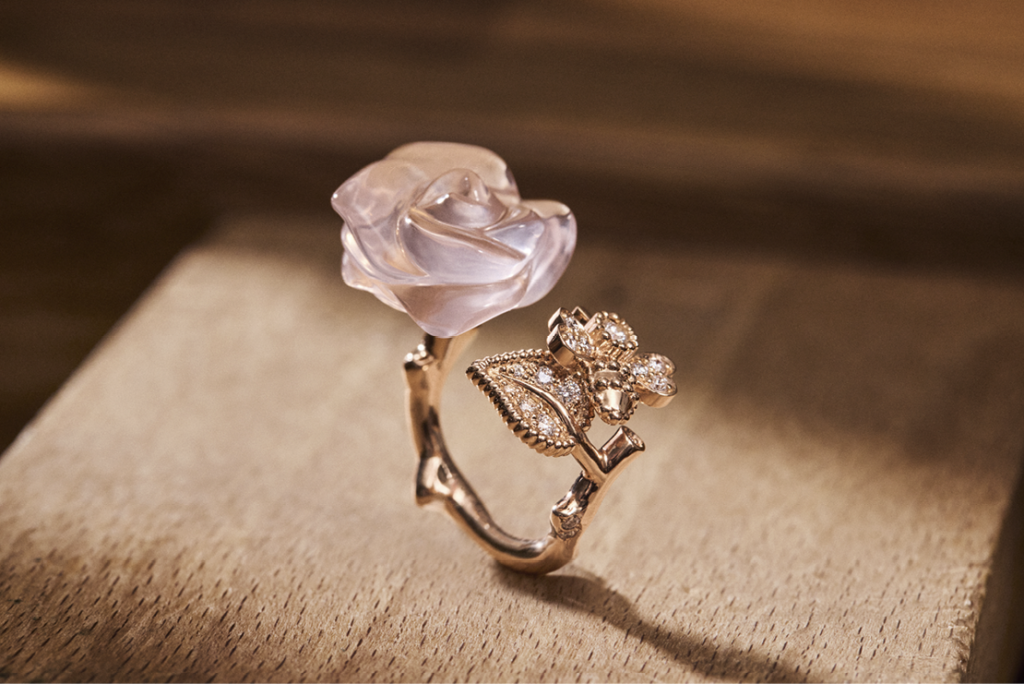 The Rose Dior Pré Catelan pieces offer a warmer, more sensual interpretation of the motif. Rendered in rose gold and adorned with rose quartz, these creations evoke the tenderness of dawn light and the serenity of a spring garden. The subtle interplay between the metal and the translucent gemstone reveals a refined, modern romanticism.