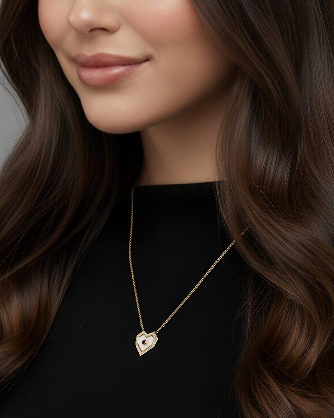 The heart is framed with diamonds that form a circle around it, almost like a community standing together in support. At the centre, the heart is crafted from mother-of-pearl, chosen for its soft, calming presence and sense of serenity. Finally, a ruby sits at the centre, a stone associated with life, courage, strength and resilience. Each element carries meaning. Together, they create a piece that tells a story of hope, compassion, and collective support.