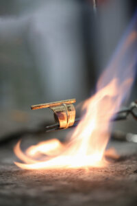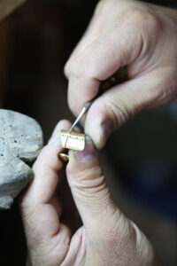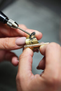 The ring and its hand-set line of diamonds are fashioned through the precision of a lost-wax casting process. Once cast, the pieces are meticulously polished in the workshop. Finally, the two elements, each carrying its own powerful aesthetic, are welded together by a flame in the purest of jewellery traditions.