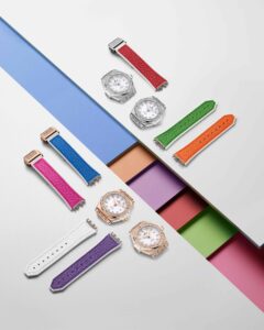 The stylish Big Bang One Click is being introduced in three new sizes with a fashionable twist. Featuring a collection of twelve silky bracelets cut from “soft touch” grained calf leather, this classic design is instantly transformed at the click of a button. Available in King Gold or steel, partially or fully set with diamonds, the cases feature black or white polished dials, around which the precious hours are arranged. Twelve stylish coloured leather straps can be attached to the watch depending on your mood, time of day or occasion.