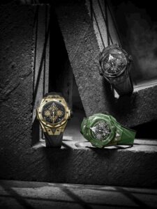The Hublot X Sang Bleu story continues with three new iterations of the Big Bang Sang Bleu II to mark the 7th year of the collaboration. Tattoo artist Maxime Plescia-Buchi chose to apply his ink to two iconic materials born from the Hublot Art of Fusion: Magic Gold and ceramic. Hublot used the strongest materials onto which the master tattoo artist’s designs alternate and are superimposed on the case and bezel and extending to the rubber strap. This geometry reveals that of the HUB1240 manufacture self-winding Unico chronograph movement, which is visible beneath a skeleton dial and a transparent case back. Limited to 100 pieces for the Magic Gold version, 250 for the Black Magic in full black ceramic and 200 for the Green Ceramic.
