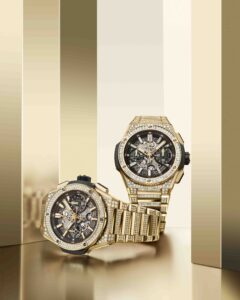 Introducing six new models in yellow gold is a key moment for the brand, marking the first time Hublot has used this colour gold in 40 years. Each of the pieces represents a moment in the Manufacture’s history and the way in which it is moving forward. The six new watches in yellow gold are: the Big Bang Integral, designed from a single block of solid gold. It is also available fully set with diamonds, alongside the ultimate Haute Joaillerie version. Then we have the Big Bang Unico and the sculptural Spirit of Big Bang. The Big Bang is the first to feature a 42mm case entirely in yellow gold with a rubber strap and Unico movement. It is the ultimate embodiment of Hublot’s 100% manufacture ethos, and features a calibre with a 3-day power reserve and an exterior that fuses yellow gold, deep black, skeleton work, performance and power. And finally, the Spirit of Big Bang, which takes the form of an exquisite tonneau with alternating straight lines and curves, featuring polished and satin-finished surfaces of brilliant yellow gold which create a spectacular dance of light. It comes in a 42mm version with skeleton movement,
