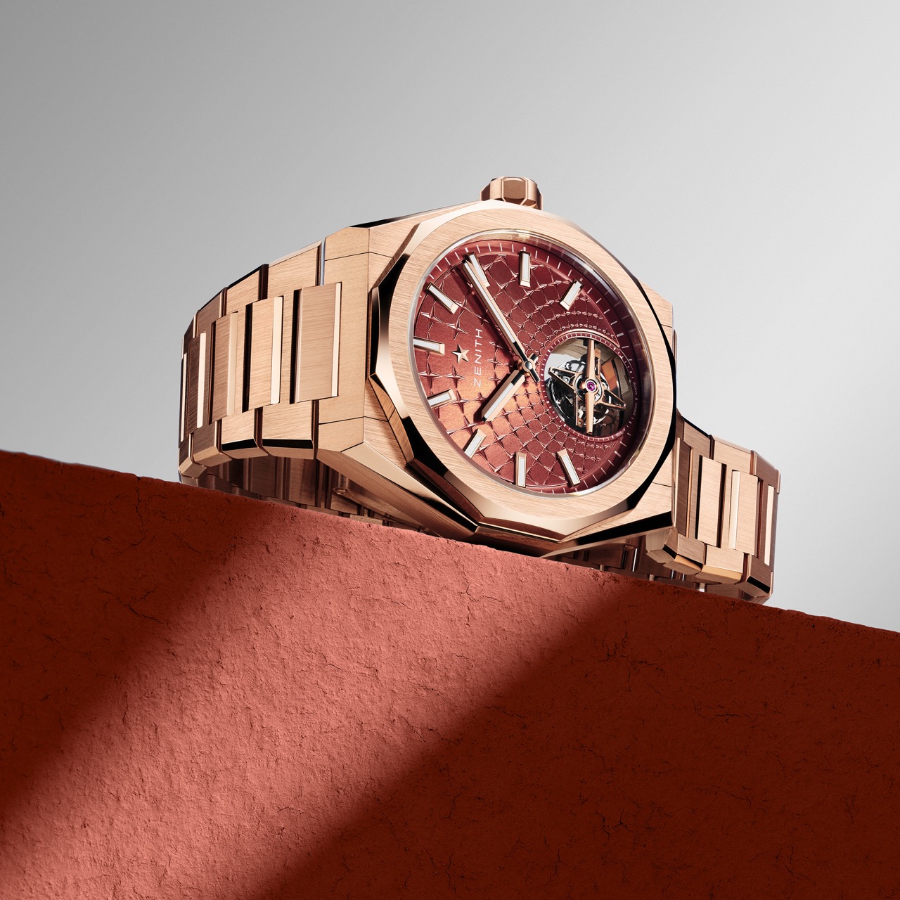The watch is fitted with an integrated rose-gold H-link bracelet that tapers seamlessly into the folding clasp for comfort. A brick-red rubber strap, matching the dial, is also included. Both can be easily exchanged using ZENITH’s quick-change system without the need for tools.